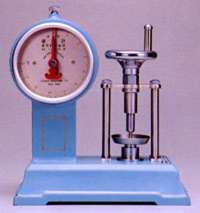 一定の力が加わって試料が圧砕すると、試料台の加圧アタッチメントとの間に若干の隙間を生じ、上の方へはね返り補助指針を残して器内のスプリングとダイヤルの指針も0点の方へはね返ります。