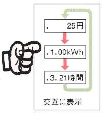 | 表示項目 1.積算電気料金(単位:円) 2.積算電力量(単位:kWh) 3.積算通電時間(単位:時間) (以上の3項目を3秒間サイクリック表示します。) |